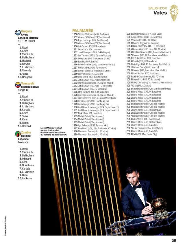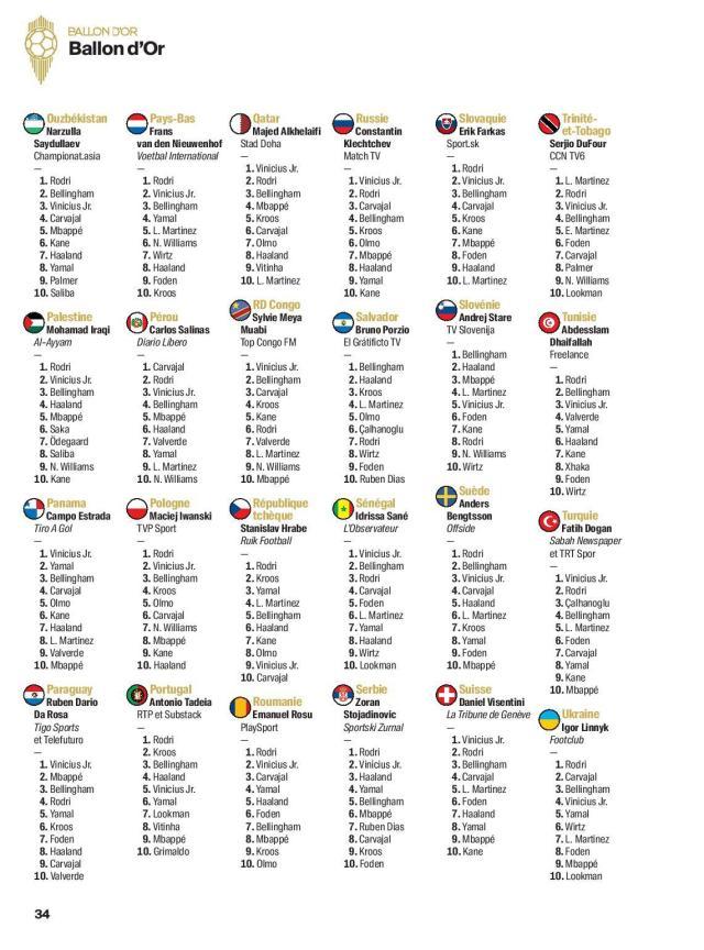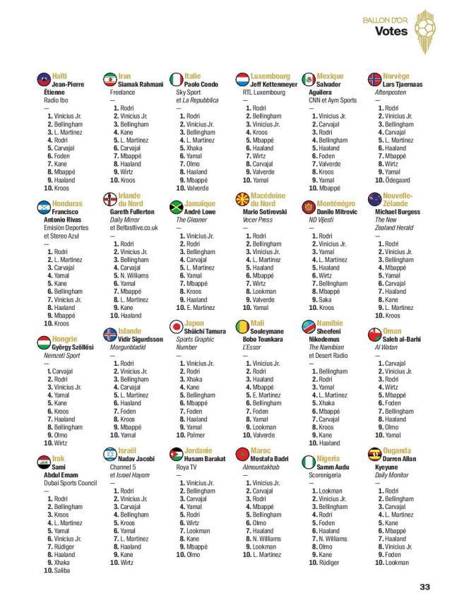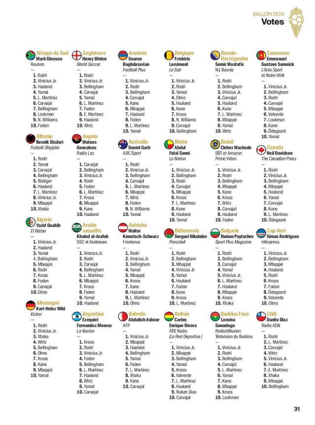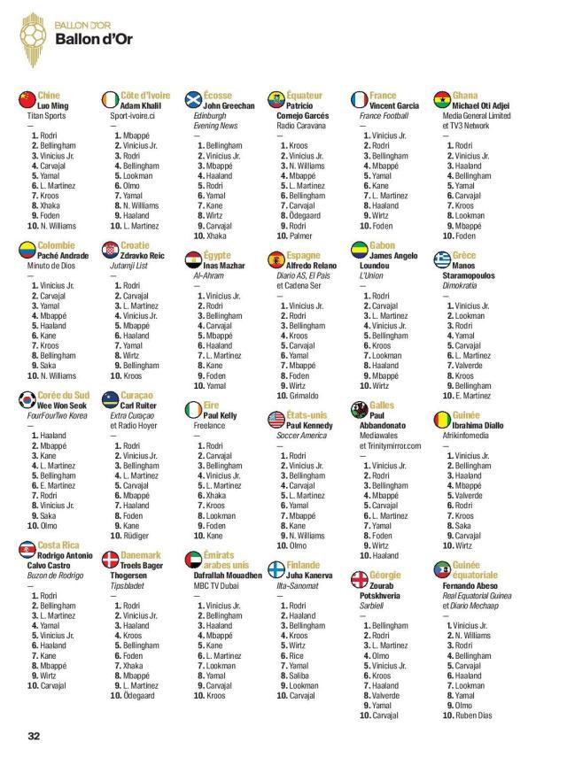 随着最新一期的《法国足球》杂志上市,2024年金球奖各国评委的投票明细终于水落石出,争议最大的男足金球奖评选结果,也得到了公正的解答。按照今年修改后的评分规则,来自全世界100个国家的记者从30名候选者中选出10人,依次获得15、12、10、8、7、5、4、3、2和1分,最后统计所有选票的分数,决出获奖者。