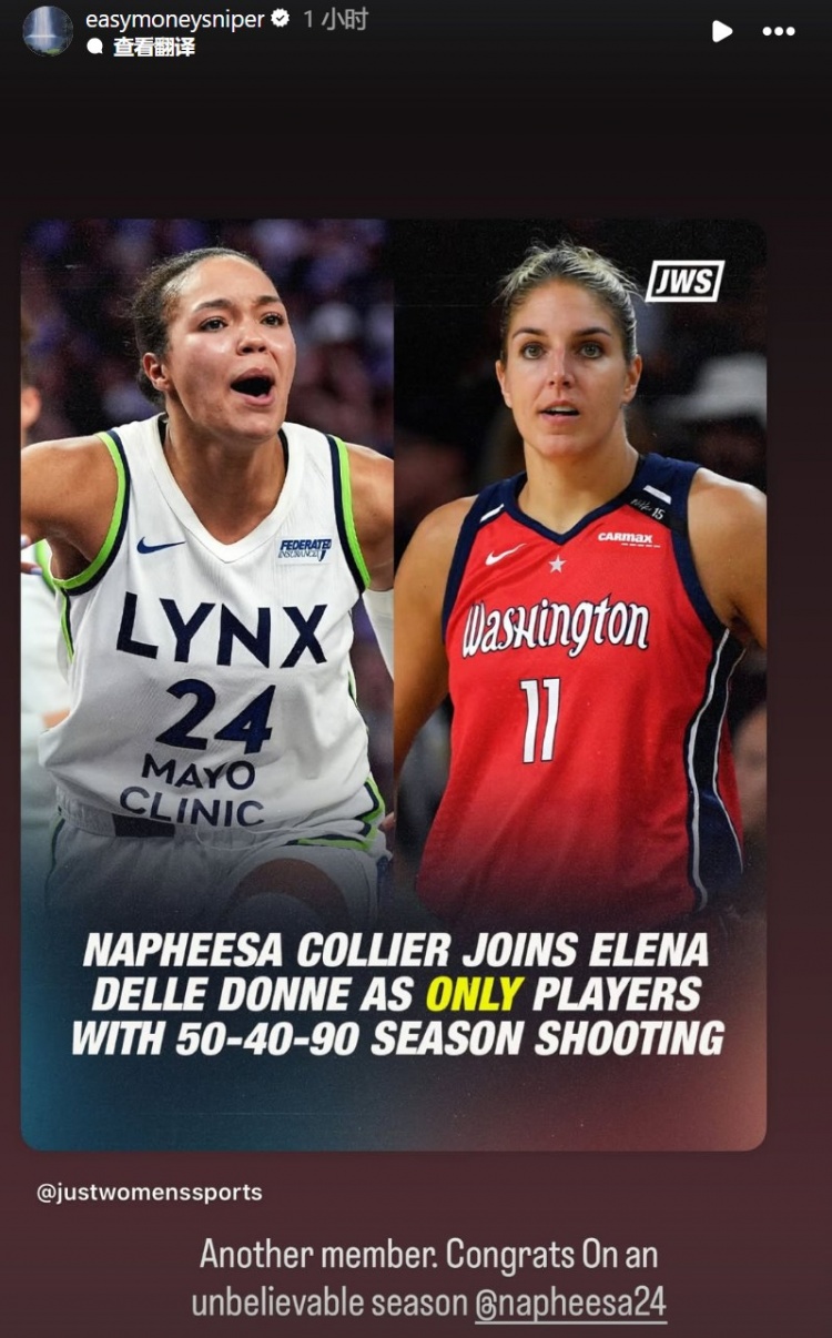 科利尔跻身赛季180俱乐部并成为WNBA历史第二人,杜兰特转发祝贺